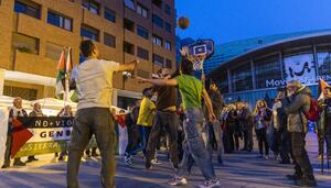 Un centenar de personas se concentra en la explanada del Movistar Arena, en Madrid, para protestar contra la presencia del Hapoel de Tel Aviv, que jugaba contra el Real Madrid.